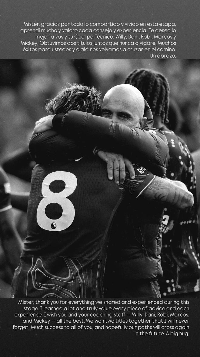 恩佐用西英双语写道:“教练,感谢您在这段共事时光里,与我们一同走过的路、并肩经历的一切。这段日子,我受益匪浅,也由衷珍视您给予的每一句教诲、每一段经历。